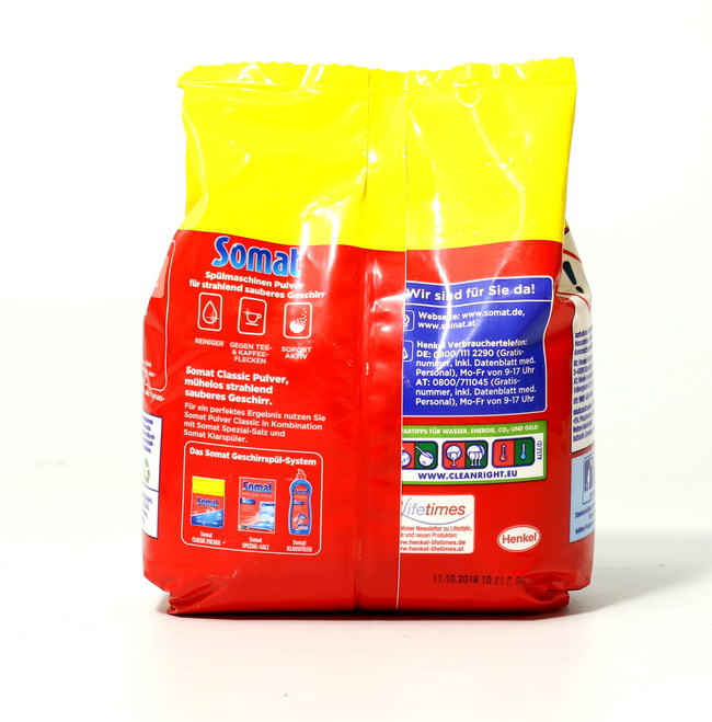 Bột rủa bát SOMAT DETERGENT POWDER (mới ). Là dòng sản phẩm giúp sử dụng tiết kiệm hơn được nhập khẩu nguyên túi từ CHLB Đức giúp làm sạch bát đĩa nhanh chóng, diệt khuẩn, bảo vệ máy trong quá trình hoạt động. An toàn hơn với người sử dụng. Sản phẩm được sản xuất tại CHLB Đức đạt tiêu chuẩn Châu Âu.